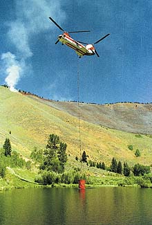 A Boeing Vertol 107 hovers over Penny Lake as its bucket dips 550 gallons of water from the pond during mop up operations on the Sage Fire.