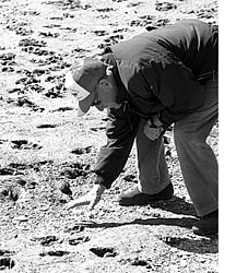 measures his right hand against one of hundreds of wolf prints set in a muddy